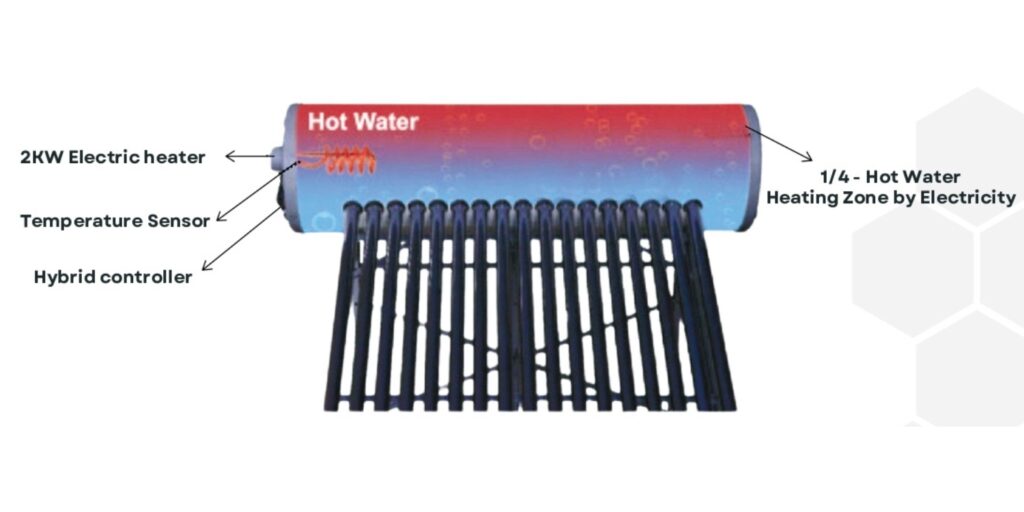 For solar water heaters (e.g., 100 LPD capacity or higher), if hot water is depleted or the temperature drops below 50°C during the scheduled period, the Hybrid Control System automatically activates the electric heater to provide sufficient hot water for all users.